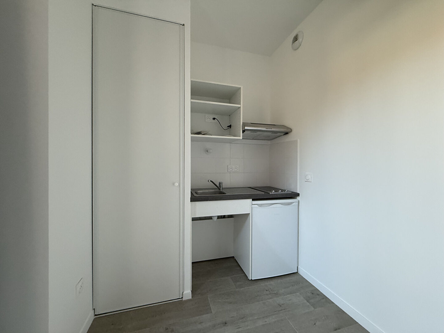 Mignon T1 25m² en RDC, coin cuisine aménagé et équipé ouvert sur séjour, salle d'eau et WC.