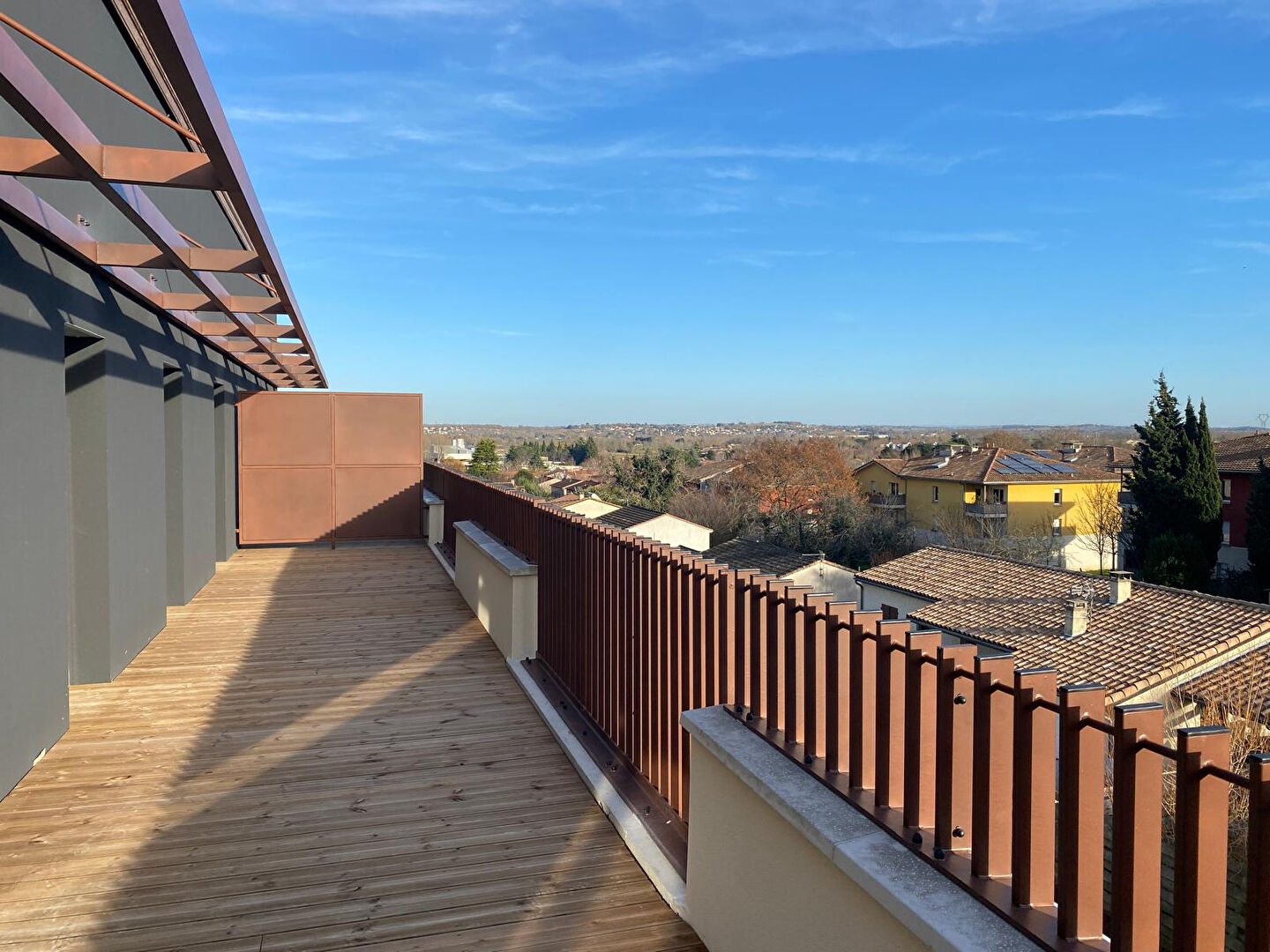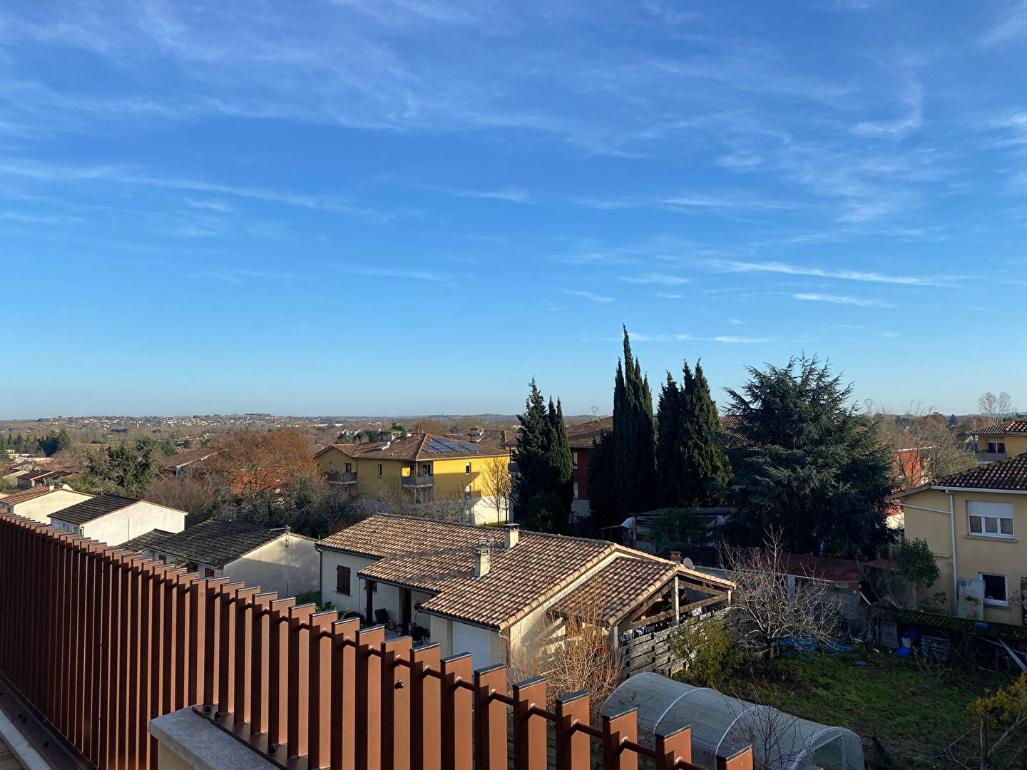 CASTANET TOLOSAN 2 pas du coeur du village commerçant , beau T4 135m² utiles en "villa sur le toit" + vaste terrasse "plein ciel" 63m² . En dernier étage . Belle vue dégagée sur les jardins, jolie orientation plein sud . restations de grande qualité (que des PF) . Labels thermiques et acoustiques. Climatisation 3 parkings sous sol. A VISITER.